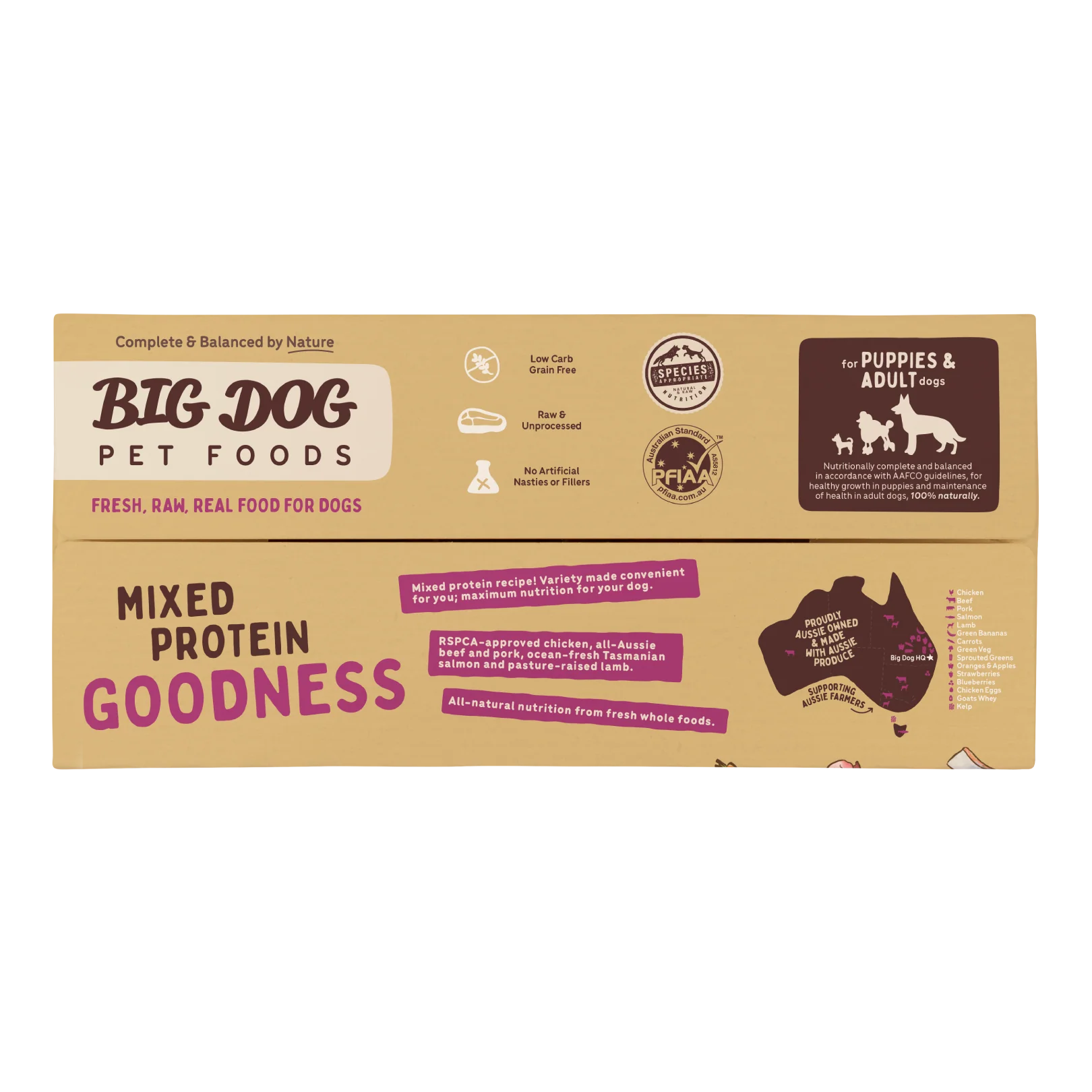 With the addition of Big Dog’s special extra ingredients, including organic fulvic acid, whole eggs, psyllium, goats whey, kelp and sprouted wheatgrass, your dog will be happy and healthy.