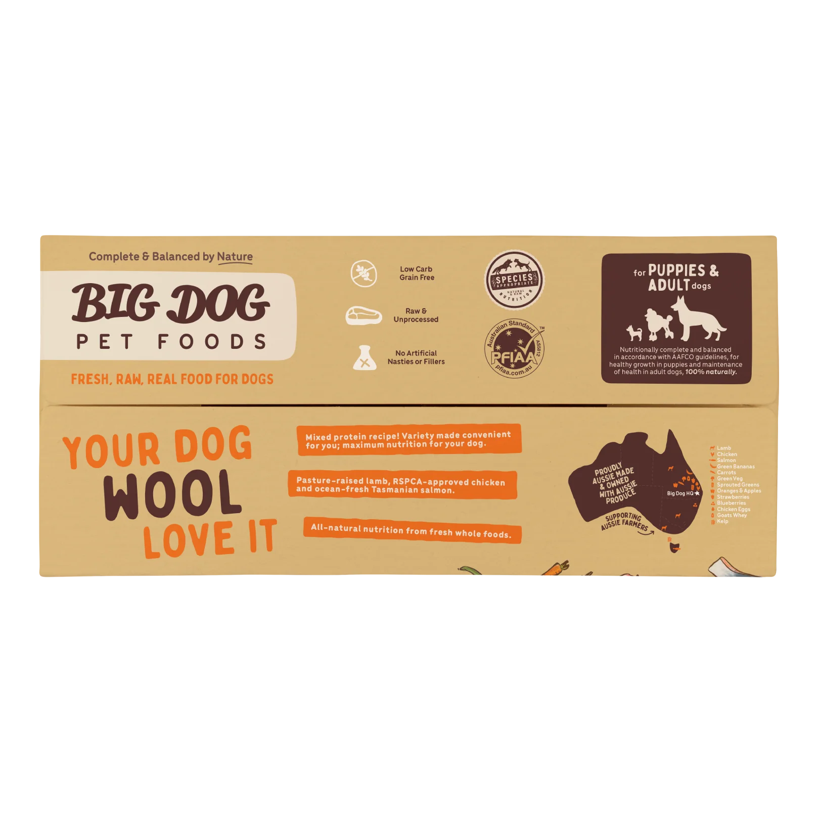 This recipe also provides a biologically appropriate amount of nutrient-dense fresh fruits and vegetables, as well as those extra special ingredients you know and love from Big Dog including sprouted wheatgrass, psyllium, goats whey, kelp and organic fulvic acid for optimal health and wellbeing. Your dog will be barking for more Big Dog Lamb!