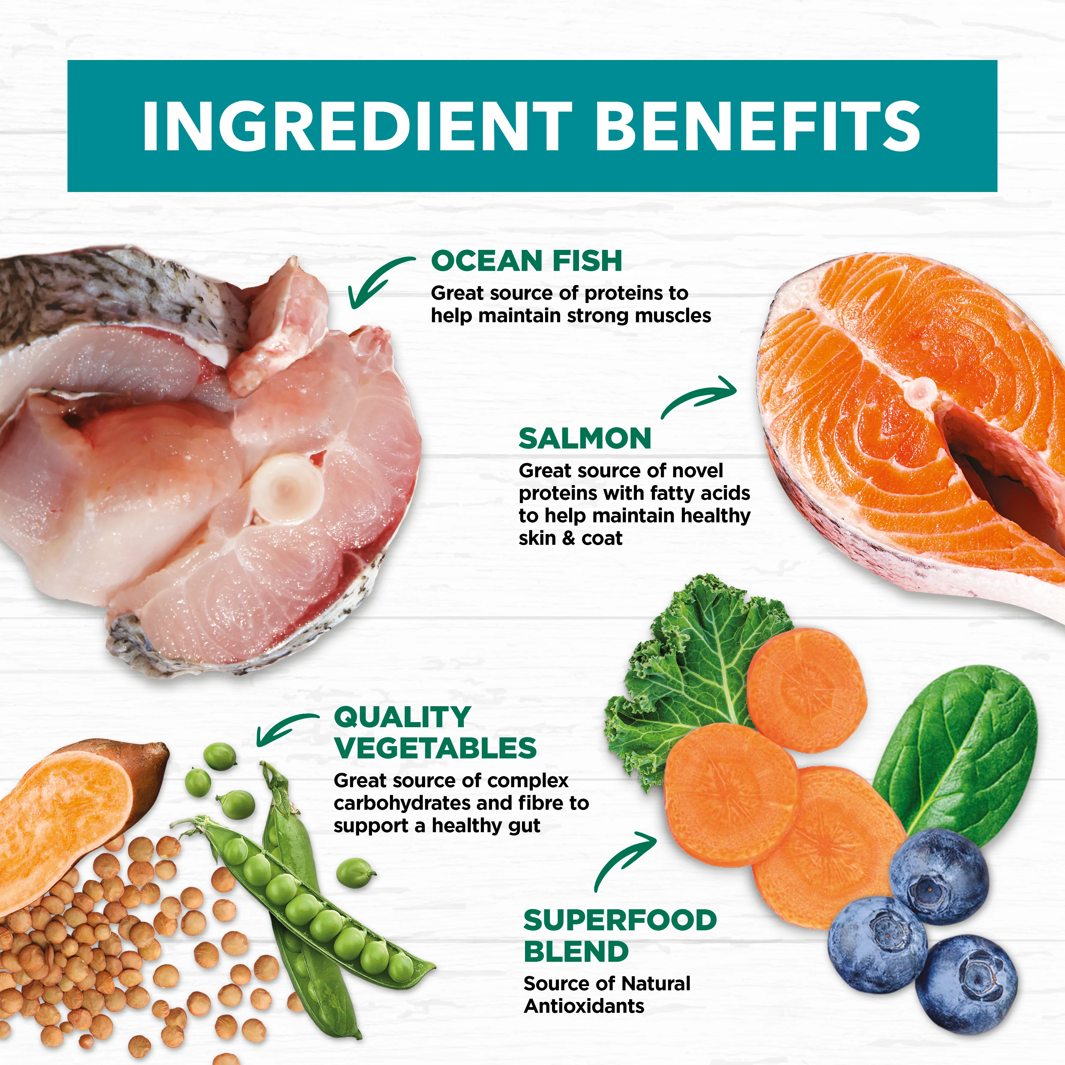 Our Salmon & Ocean Fish Grain Free formula is formulated without poultry, tailored for dogs sensitive to poultry protein.